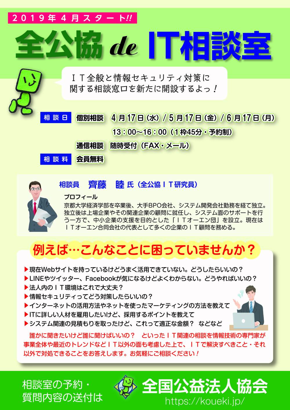 2019年4月から、全国公益法人協会様にて開催されるIT相談室にて、IT相談員としてご相談を承ることになりました。